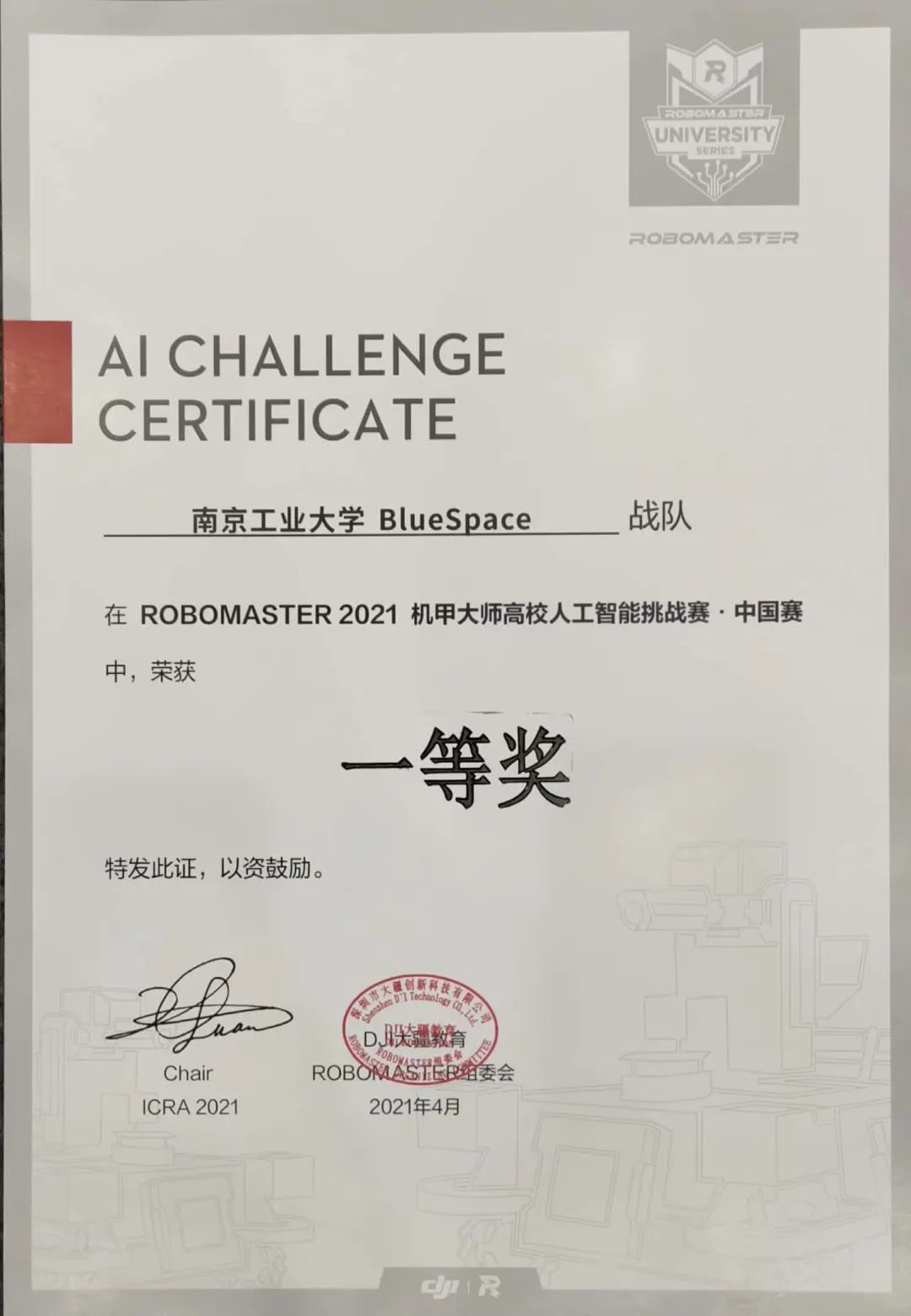4月1日,由yl23455永利官网沈捷、孙振兴等老师指导并带领的南京工业大学BlueSpace战队首次应战RoboMaster2021机甲大师高校人工智能挑战赛•中国赛,经过小组淘汰赛、2/4等激烈角逐,奋勇争先、重重突围,以精准的自瞄和稳健的操作脱颖而出,挺进全国决赛。决赛中,BlueSpace战队依然保持不骄不躁、顽强拼搏的精神,获得大赛全国排名第二的优异成绩,最终获得大赛一等奖!本次挑战赛覆盖了国内顶尖工科985院校、中科院自动化所和牛津剑桥等海外强队,南京工业大学BlueSpace作为一支由一、二年级学生为主力军的新兴战队,年轻之星冉冉升起。